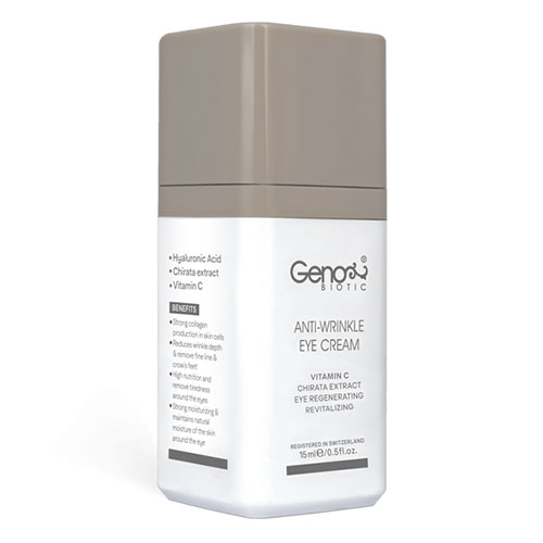 چین و چروکهای اطراف چشم دلایل مختلفی از جمله افزایش سن و سال، پلک زدن، عادات غلط مالیدن چشم با قدرت و یا استفاده از محصولات مراقبتی بیکیفیت باشد. با مرور زمان چین و چروک افزایش یافته و پوست حساس اطراف چشم دچار پیری و یا سیاهی میگردد. یکی از راههای پیشگیری از ایجاد چین و چروک استفاده از کرمهای مراقبت دور چشم است. کرم ضد چروک دور چشم ژنوبایوتیک با بهره گیری از خواص گیاه چیترا به رفع خطوط پنجه کلاغی اطراف چشم کمک میکند. این کرم سبب تولید و نوسازی سلولهای پوستی جدید میشود و به جوانسازی پوست اطراف چشم کمک میکند. هیالورونیک اسید موجود در این کرم پوست را به خوبی آبرسانی کرده و مانع از خروج رطوبت از پوست میگردد. ویتامین سی موجود در این محوصل آنتی اکسیدان قوی بوده که سبب کلاژن سازی و رفع پف و سیاهی اطراف چشم شده و خاصیت ارتجاعی پوست را بهبود میبخشد. استحکام بافت پوست میتواند پوستی شاداب و عاری از چین و چروک برای شما به ارمغان آورد.