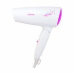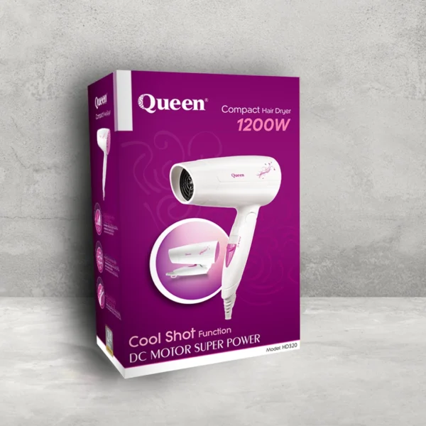 سشواری مسافرتی کویین (queen) مدل HD320 دارای دستهی تاشو و موتور 1200 وات DC است که در دو رنگ صورتی و خاکستری و اندازهی کوچک برای استفاده در منزل و مسافرت ساخته شده است. روی دستهی سشوار یک دکمهی چهارحالته وجود دارد که برای روشن/خاموش کردن سشوار و تنظیم سرعت و حرارت باد استفاده میشود.علاوه بر دو حالت ترکیبی سرعت و حرارت یک حالت باد سرد نیز وجود دارد. در حالت باد سرد المنت سشوار از کار میافتد و میتوان حالت مو را تثبیت کرد. طبق انتظاری که از یک سشوار مسافرتی میرود دستهی سشوار روی بدنه خم میشود و جای کمتری اشغال میکند. بنابراین میتوان گفت که برای مسافرت یک سشوار ایده آل است؛ اما از آنجایی که قرار است حجم این دستگاه کم باشد موتور کم قدرت تری نسبت به سشوارهای خانگی یا حرفهای دارد. موتور سشوار کویین HD320 توانی برابر 1200 وات دارد و ناگفته پیداست که از نوع DC است. بنابراین نمیتوان پرتاب باد فوقالعادهای را از آن انتظار داشت اما برای مصارف کوتاهمدت گزینهی مناسبی است. البته اگر سشواری خانگی با قدرت پرتاب باد قوی تر نیاز دارید پیشنهاد میکنیم از سشوار HD360 کوئین استفاده کنید.از ویژگی ظاهری سشوار باید به طراحی خاص فیلتر هوای آن اشاره کرد که جلوهی ویژهای به آن بخشیده است. به طور خلاصه سشوار کویین HD320 دارای موتور 1200 وات DC دو حالت ترکیبی سرعت و حرارت، حالت باد سرد بوده و با دستهی تاشو و با حجم کمی که اشغال میکند میتوان بهراحتی آن را داخل کیف و چمدان به مسافرت برد.